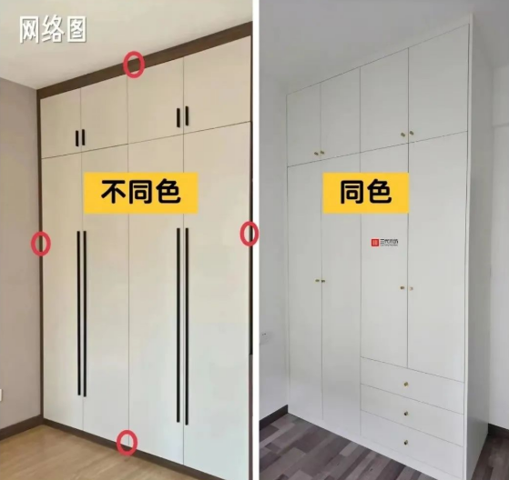 全屋定制套餐里包含的门板和柜子花色有限,大多数人为了节省预算,被迫用了不同材质的柜门和柜体,甚至还是不一样的颜色。