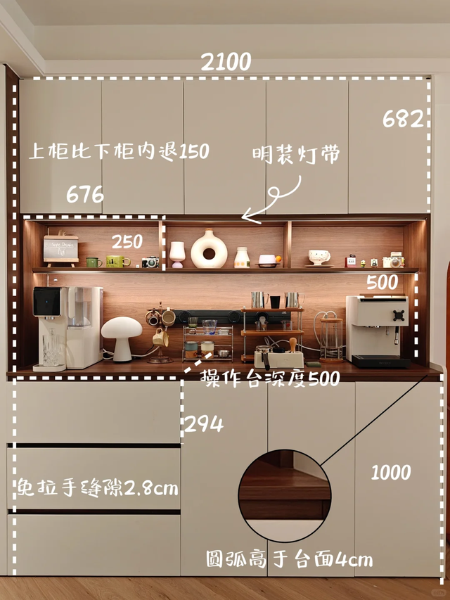 比如说,厨房吊柜的高度,橱柜的吊柜高度一般在650到720,那么如果你要做到顶的话,也是要加钱的。